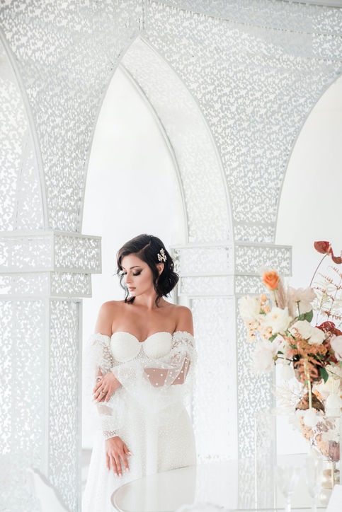 Radiating cool and contemporary, this Fall 2020 Vancouver Style File is perfect for any bride looking for a Moroccan-inspired wedding! The color palette of taupes and ivories are given the luxe treatment with rows of candles, acrylic accents, and a variety of high and low centerpieces topped with white florals. Keep scrolling for more of this geometric design!