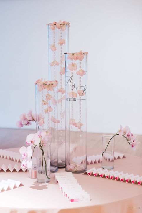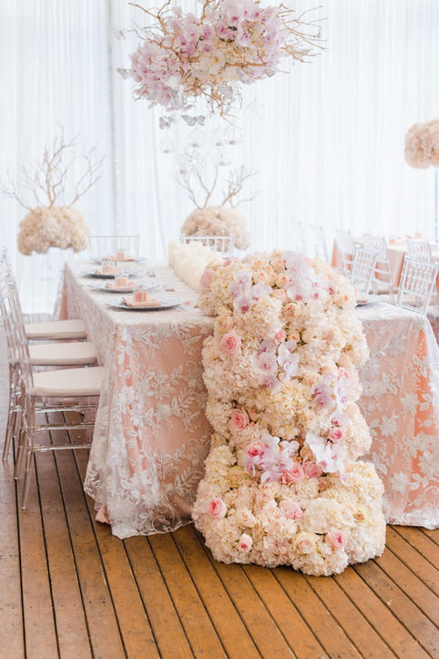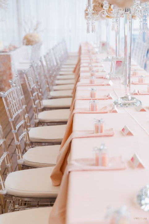 Pretty and pink – just the way we like it! After Angela and Kenny said, “I do,” the couple had an intimate soirée, with only 80 guests in attendance. “I wanted to have a simple but elegant wedding,” shares the bride. “My theme was blush pink, and my vision was a sweet, fresh, and heartwarming wedding.” With embellished peach pink linens, crystal candelabras and sculpted arrangements of blush hydrangeas, we love this pink frosted celebration!